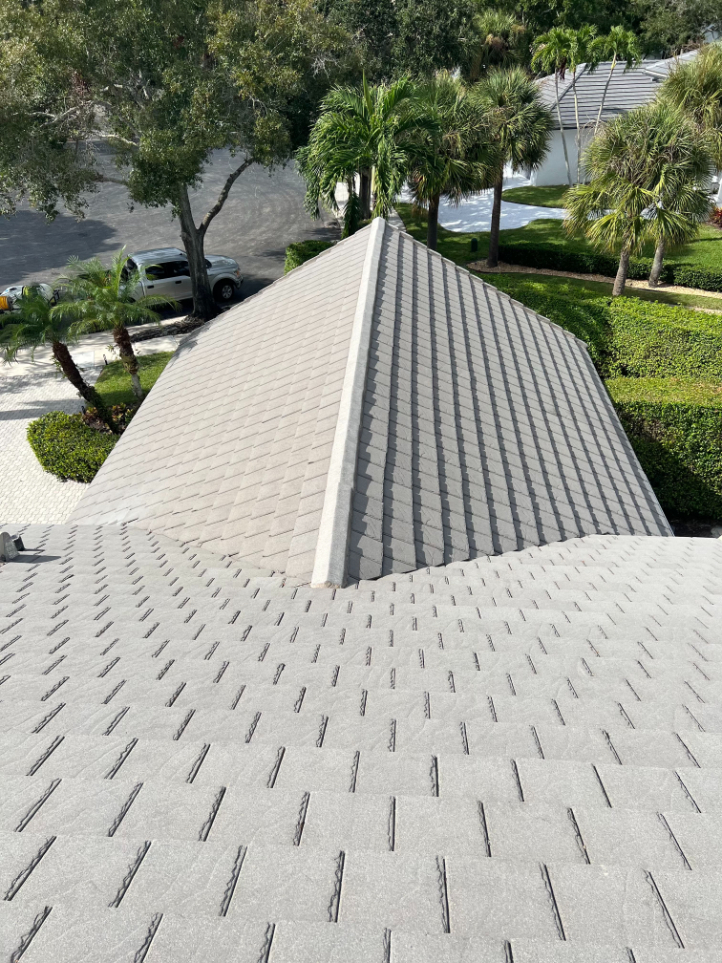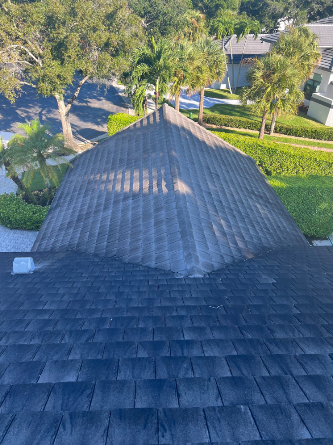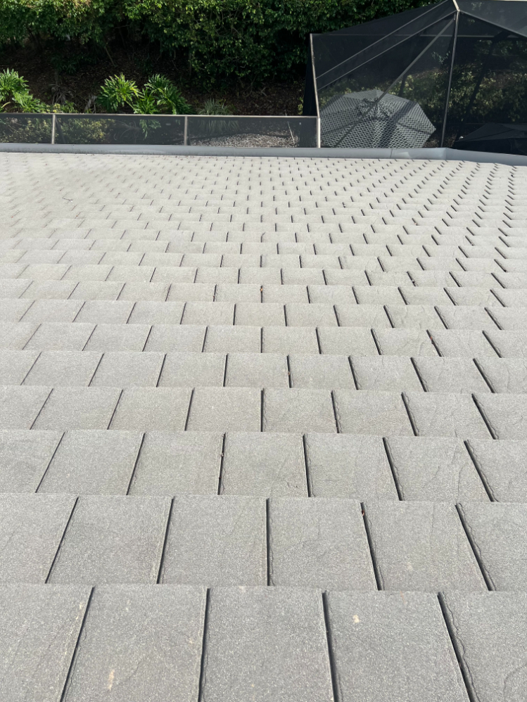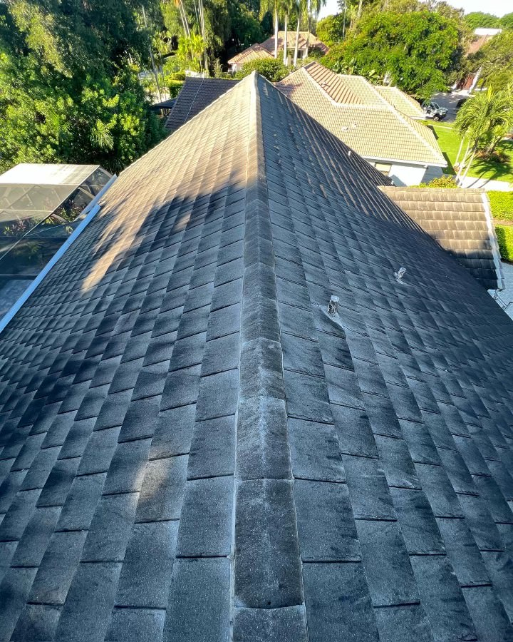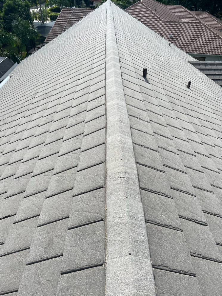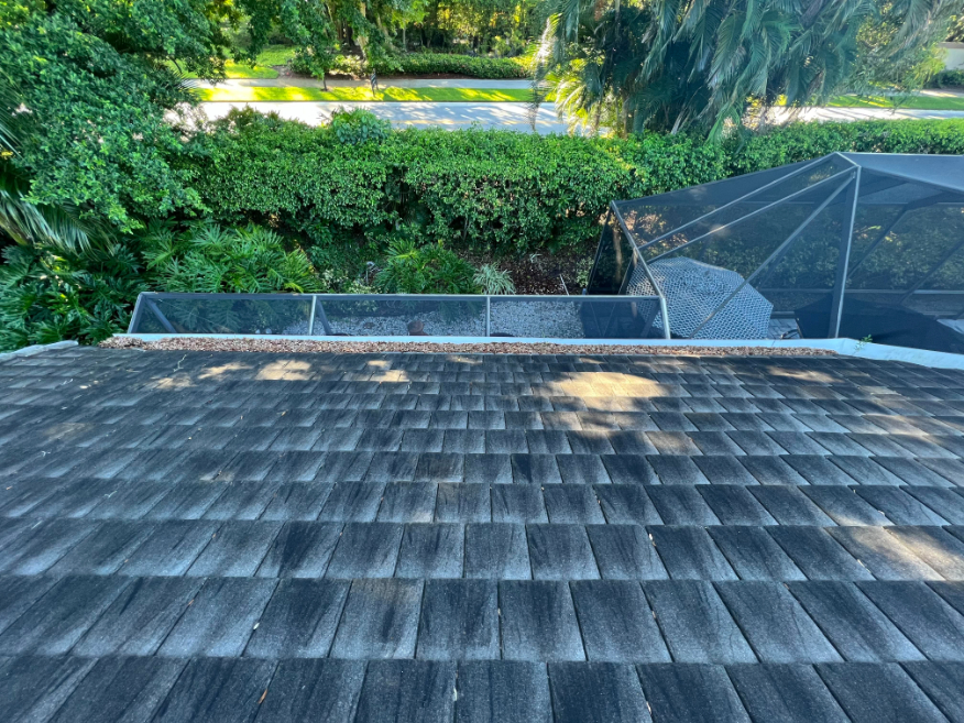 Our valued customer needed their roof cleaned before having their house repainted. We noticed the rear gutters were full with foliage. The first step was to remove the leaves so we can be sure that the gutters will drain properly. This is important not only for the softwash process but also because of the amount of rain we receive in Palm Beach County. We then applied our softwash chemical which removes all of the existing algae from the roof tiles. Once this is done, we rinse the roof thoroughly to make sure all the algae and chemical have been removed leaving the tiles looking as clean as possible.